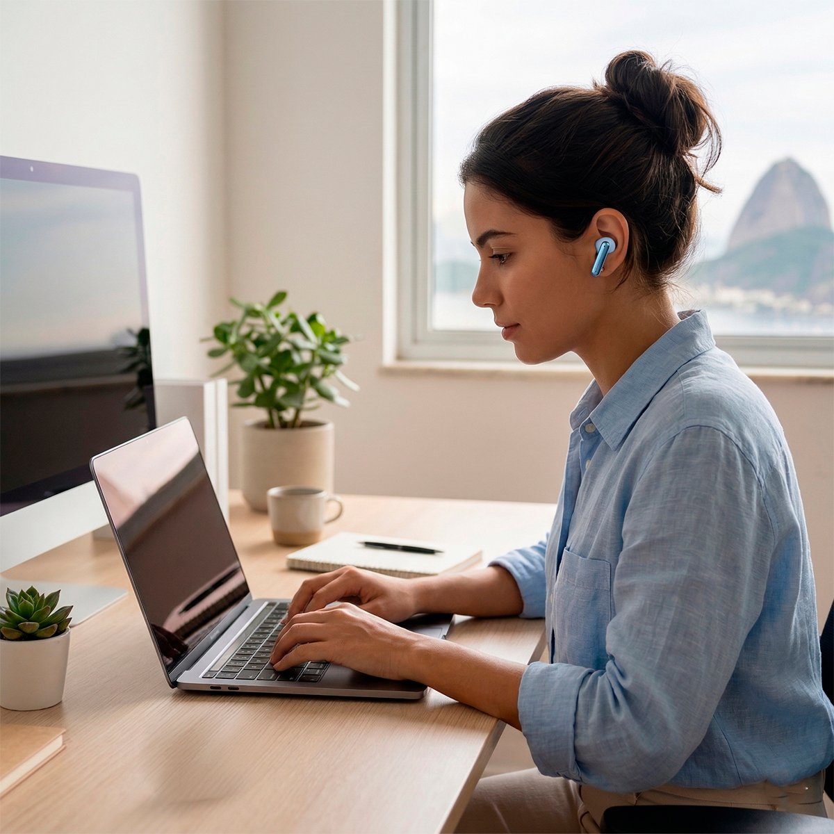 -Design “in-ear” leve que se molda ao ouvido, permitindo horas de uso sem incômodo.