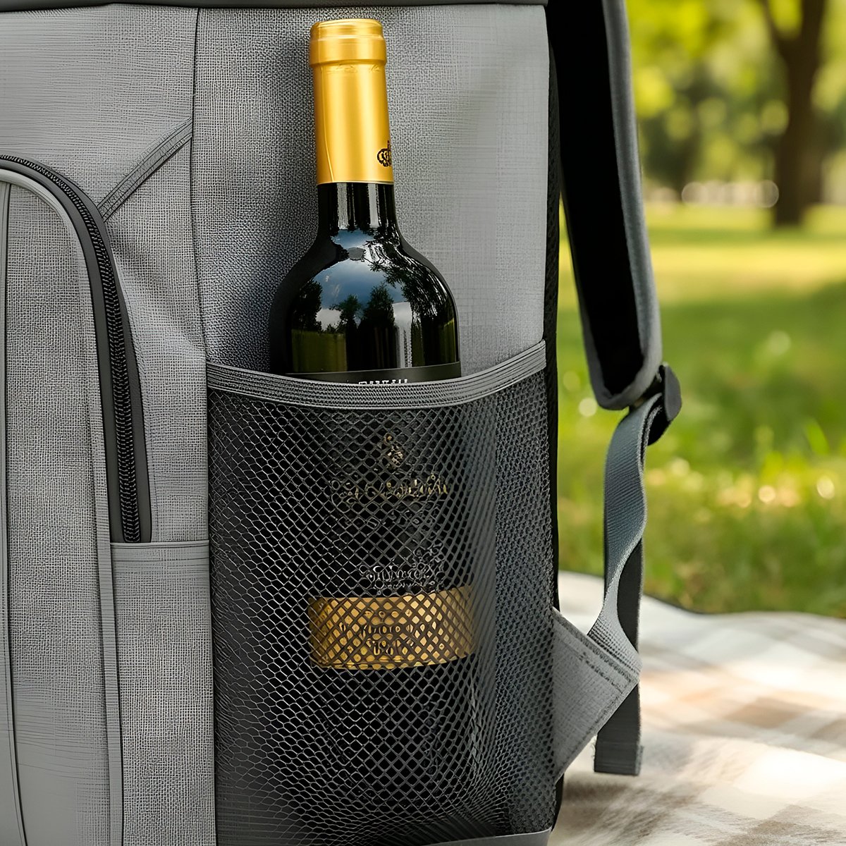 -Possui compartimento principal amplo, bolso frontal para utensílios e bolsos laterais de tela para garrafas extras.